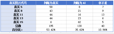 另外,AI修图的出现加剧了受访者对真实图片的不信任。对于本次问卷中混入的5张真实图片,只有53.42%的人判断图片为真,35.62%的人将图片错判为了AI图片,10.96%的人则拿不准。