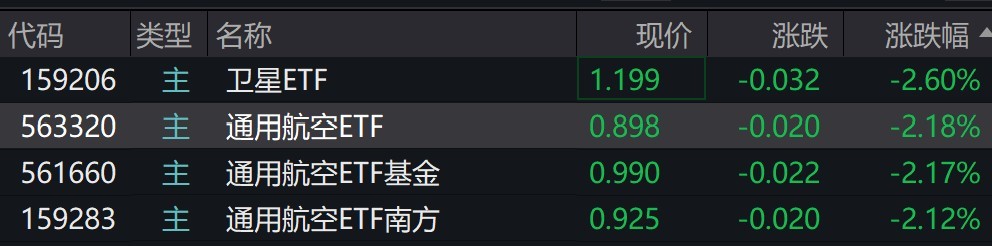 受盘面影响,卫星、通用航空相关ETF跌超2%。