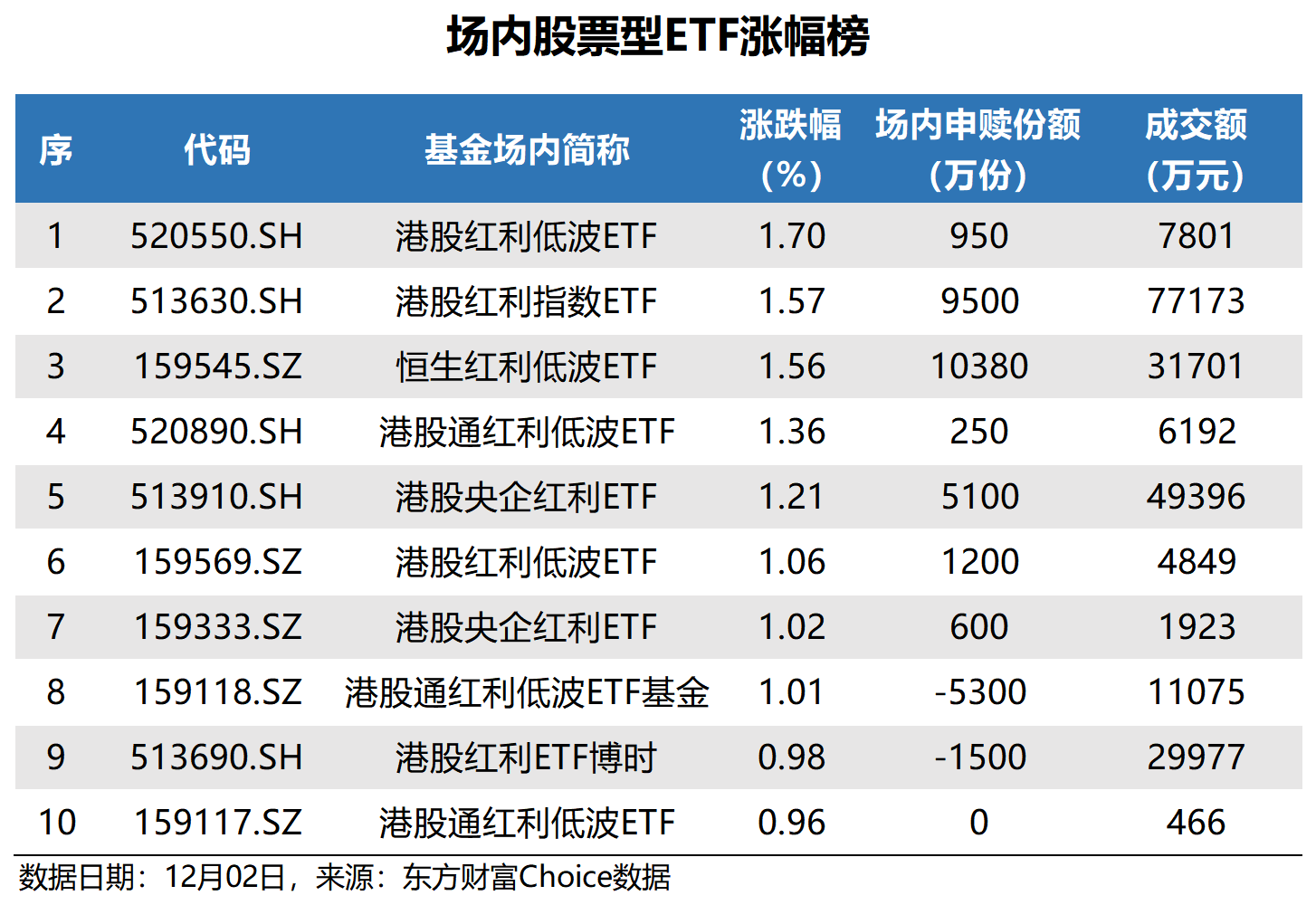 数据显示,昨日场内股票型ETF中,港股红利低波ETF、港股红利指数ETF、恒生红利低波ETF涨幅居前。其中,港股红利低波ETF涨幅最大,为1.70%。
