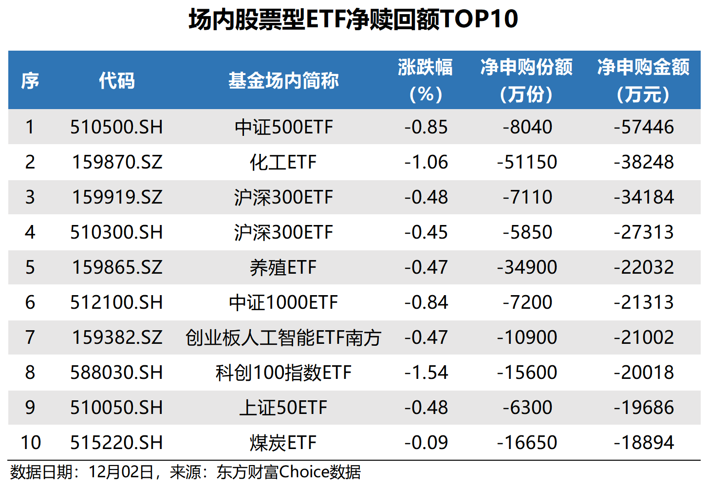 数据还显示,昨日净赎回金额最多的场内股票型ETF为中证500ETF,净赎回金额5.74亿元;化工ETF紧随其后,净赎回金额3.82亿元。