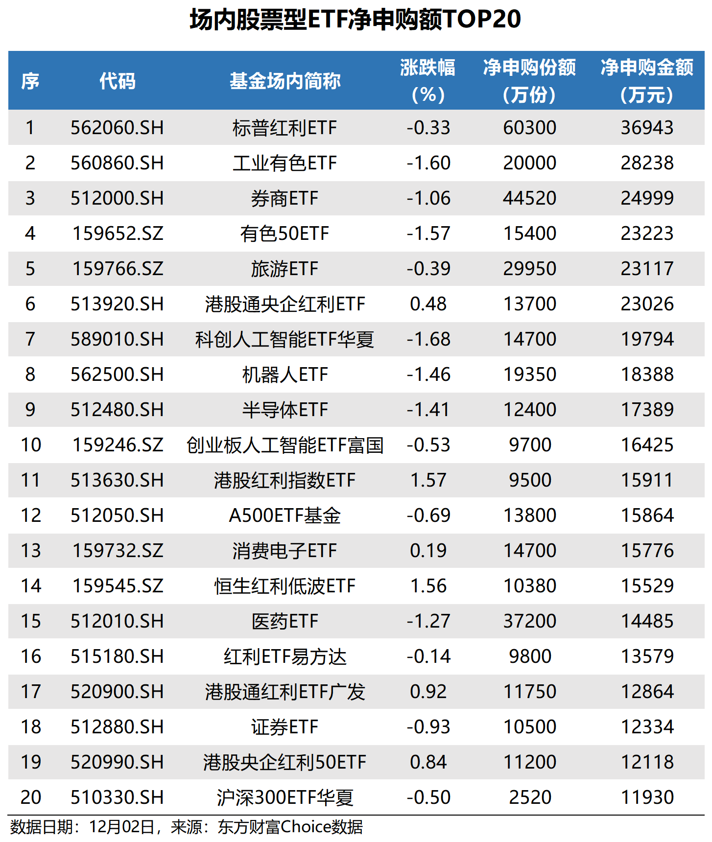 昨日,净申购金额最多的股票型ETF为标普红利ETF,净申购金额为3.69亿元。此外,工业有色ETF和券商ETF净申购居前,净申购金额依次为2.82亿元和2.5亿元。