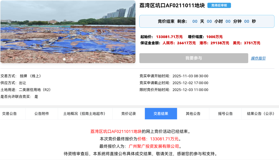 12月3日,广州荔湾区坑口玻璃厂地块成功出让,由珠江实业集团旗下珠江产投公司以25231元/平方米的楼面地价竞得。