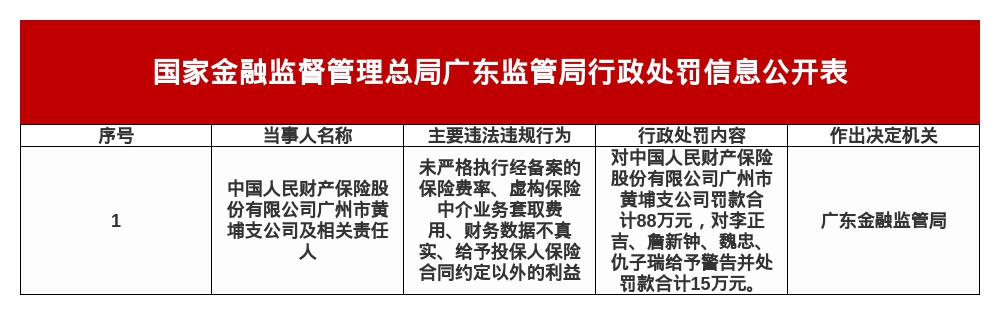 人民财险广州黄埔支公司被罚88万,责任人共被罚15万