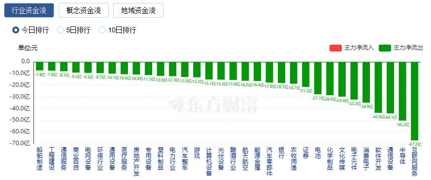 净流出方面,互联网服务、半导体、通信设备等净流出排名靠前,其中互联网服务净流出67.17亿元。