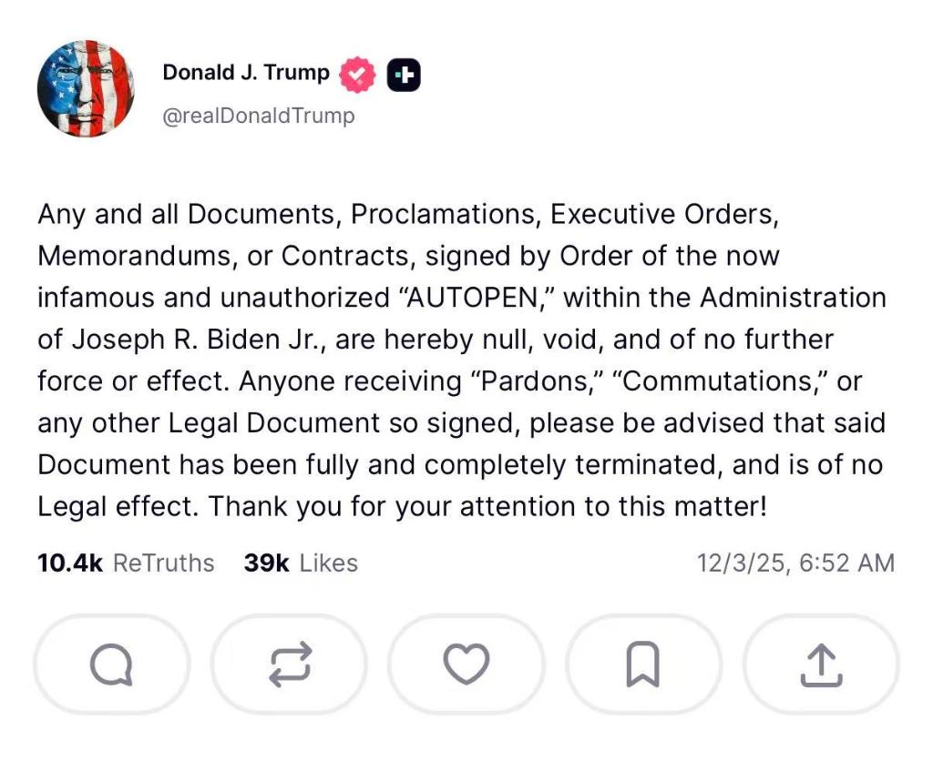 特朗普:拜登用自动签名笔签署的赦免令无效!