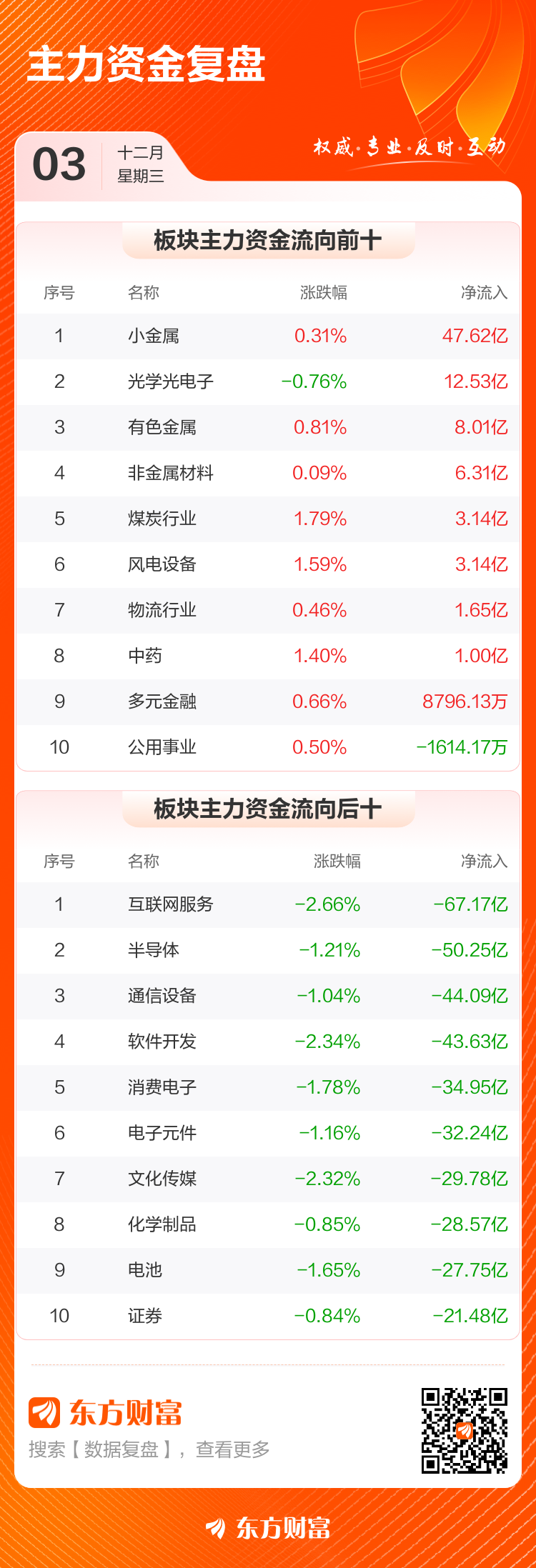 12月3日,沪指跌0.51%,深成指跌0.78%,创业板指跌1.12%。两市成交额1.67万亿,较上个交易日放量765亿。数据显示,今日大盘主力资金净流出686.96亿。小金属、光学光电子、有色金属等板块主力资金流入排名居前,其中小金属净流入47.62亿元。