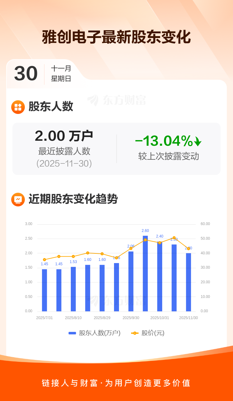 雅创电子最新披露数据显示,截至11月30日公司股东户数为2.00万户,较上期(2025年11月10日)减少3000户,降幅为13.04%。户均持有流通股数量由上期的3903股上升至4489股,户均持股金额由上期的19.76万元减少至19.35万元。