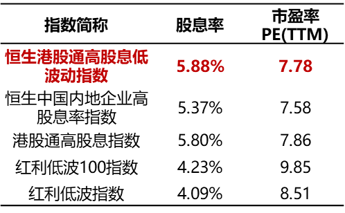 具体来看,截至12月2日,恒生港股通股息低波动指数股息率(近12月发布方股息率,下同)为5.88%,在同类红利类指数中相对更高;市盈率7.78倍PE(TTM),估值相对较低。