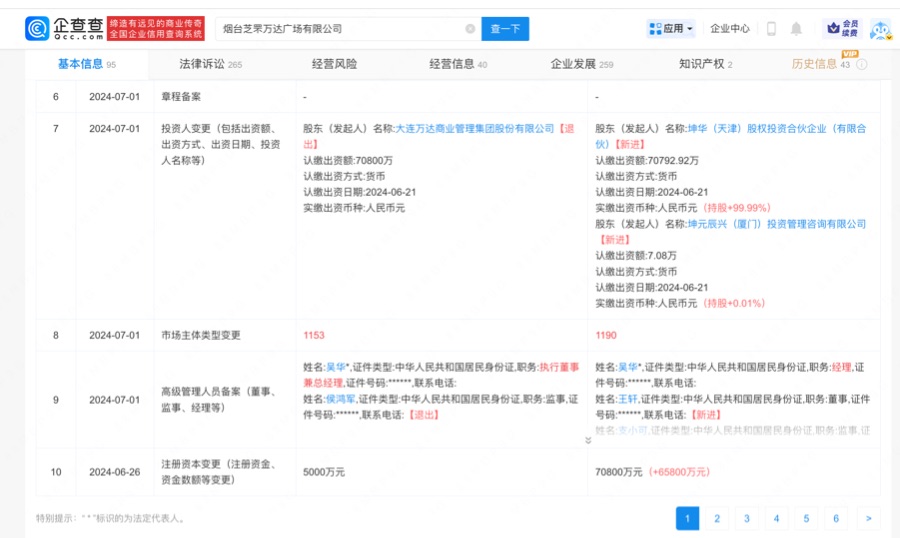 万达资产处置版图迎来罕见转折。企查查显示,近日,烟台芝罘万达广场有限公司发生工商变更,新华保险旗下坤华(天津)股权投资合伙企业(有限合伙)、坤元辰兴(厦门)投资管理咨询有限公司退出股东行列,新增大连万达商业管理集团股份有限公司(以下简称“万达商管”)旗下上海万达锐驰企业管理有限公司为全资控股股东,同时多位高管发生变更。