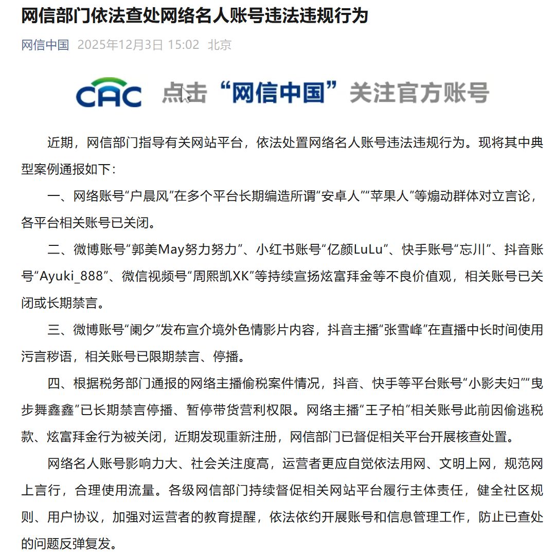 据“网信中国”公众号12月3日消息,近期,网信部门指导有关网站平台,依法处置网络名人账号违法违规行为。现将其中典型案例通报如下: