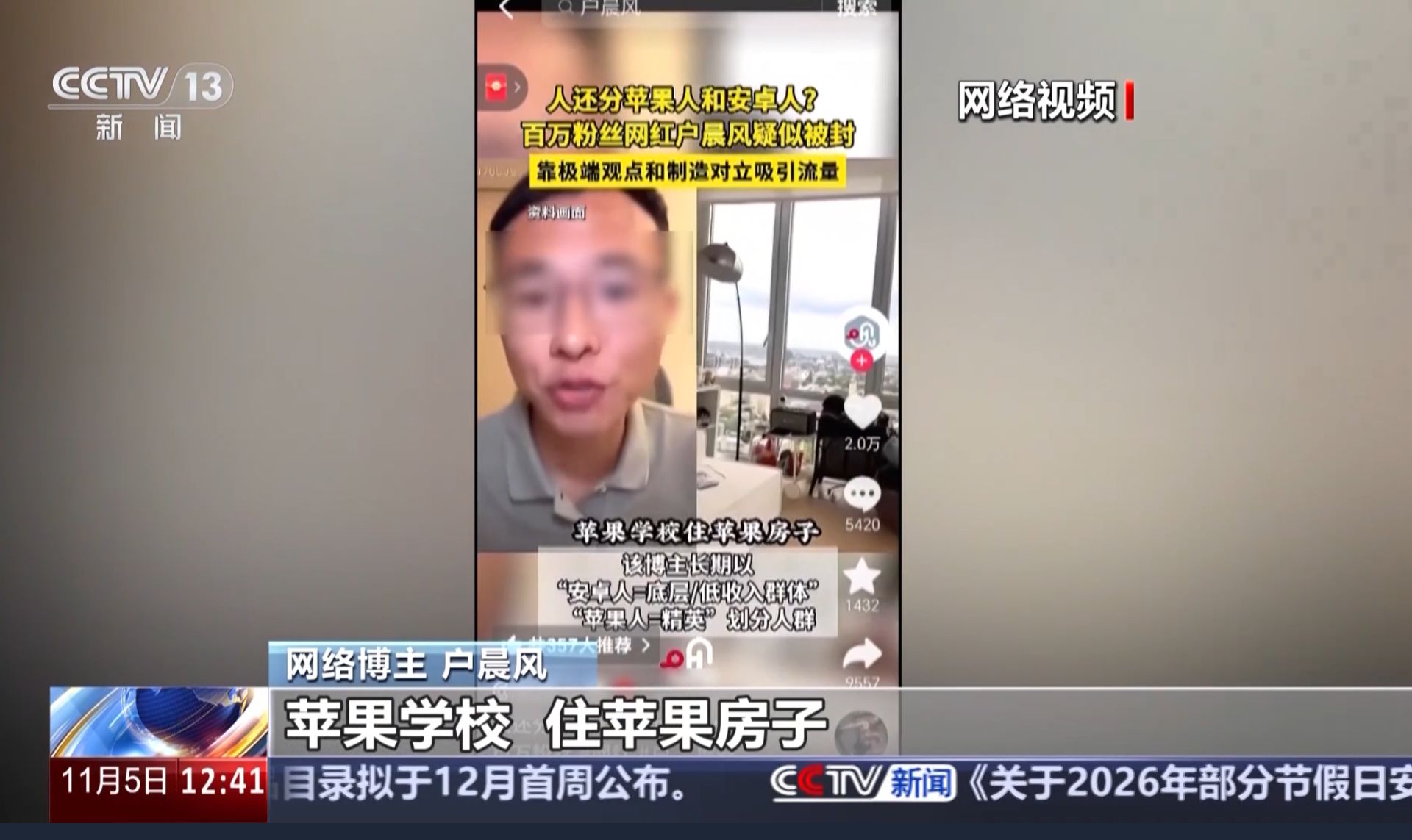 据央视新闻,通过网络自媒体账号,“恶意挑动群体极端对立、宣扬暴力戾气等负面情绪”,成为一些网红博眼球涨粉的伎俩,这种为了流量不择手段甚至涉嫌违法犯罪的营销操弄,早已饱受诟病。百万网红博主户晨风的标签言论是,你是“苹果人”还是“安卓人”,以此恶意制造社会对立,收割流量牟利。近日,其在多个平台的账号被封禁。