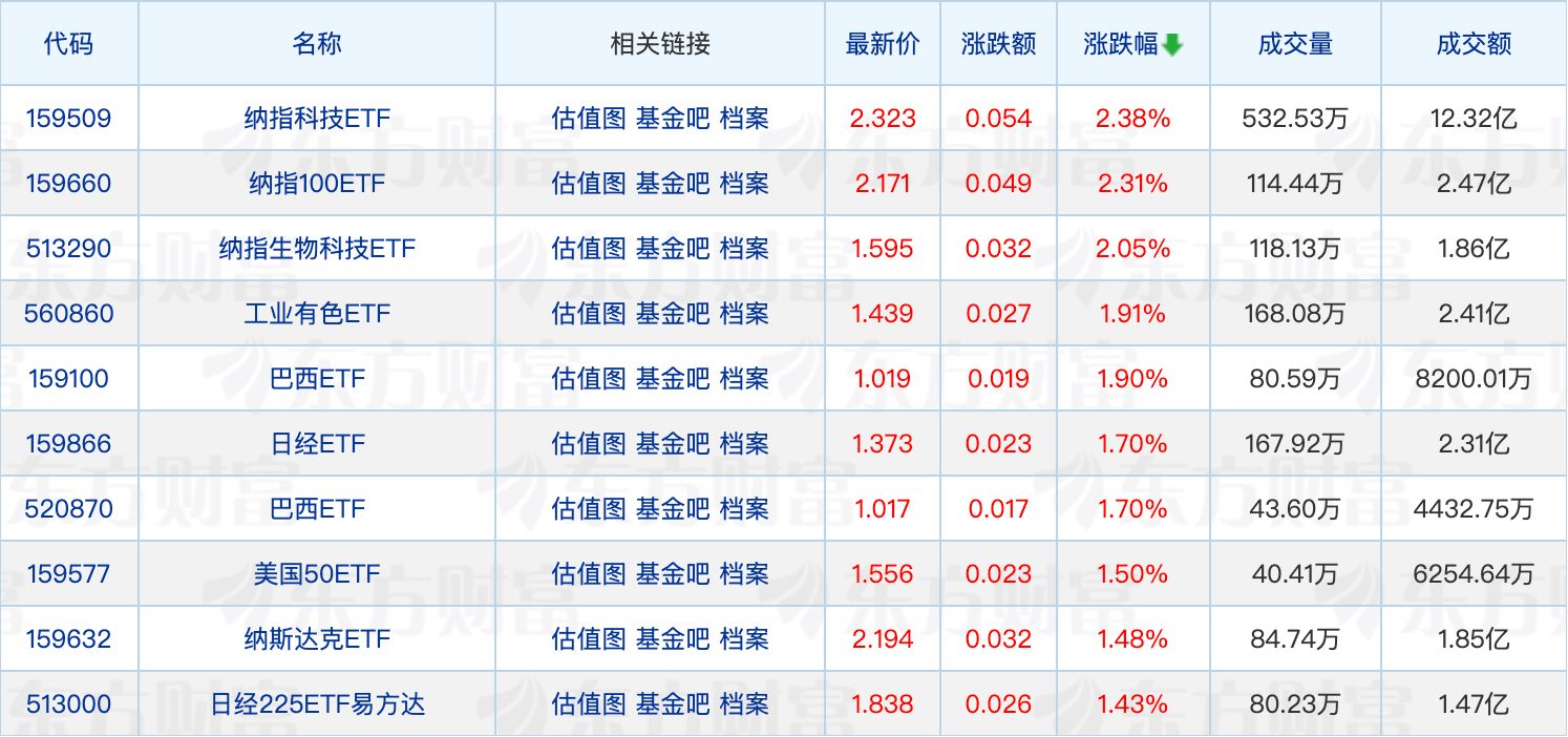具体来看,纳指科技ETF、纳指100ETF、纳指生物科技ETF涨幅均超过2%,工业有色ETF、巴西ETF也有所表现。