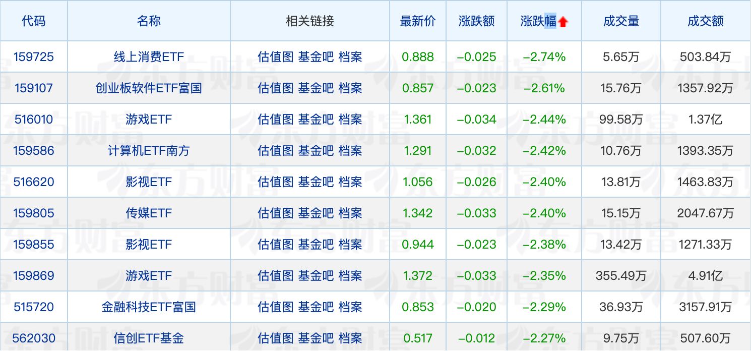 下跌方面,线上消费ETF领跌超2%,游戏ETF、影视ETF延续回调。
