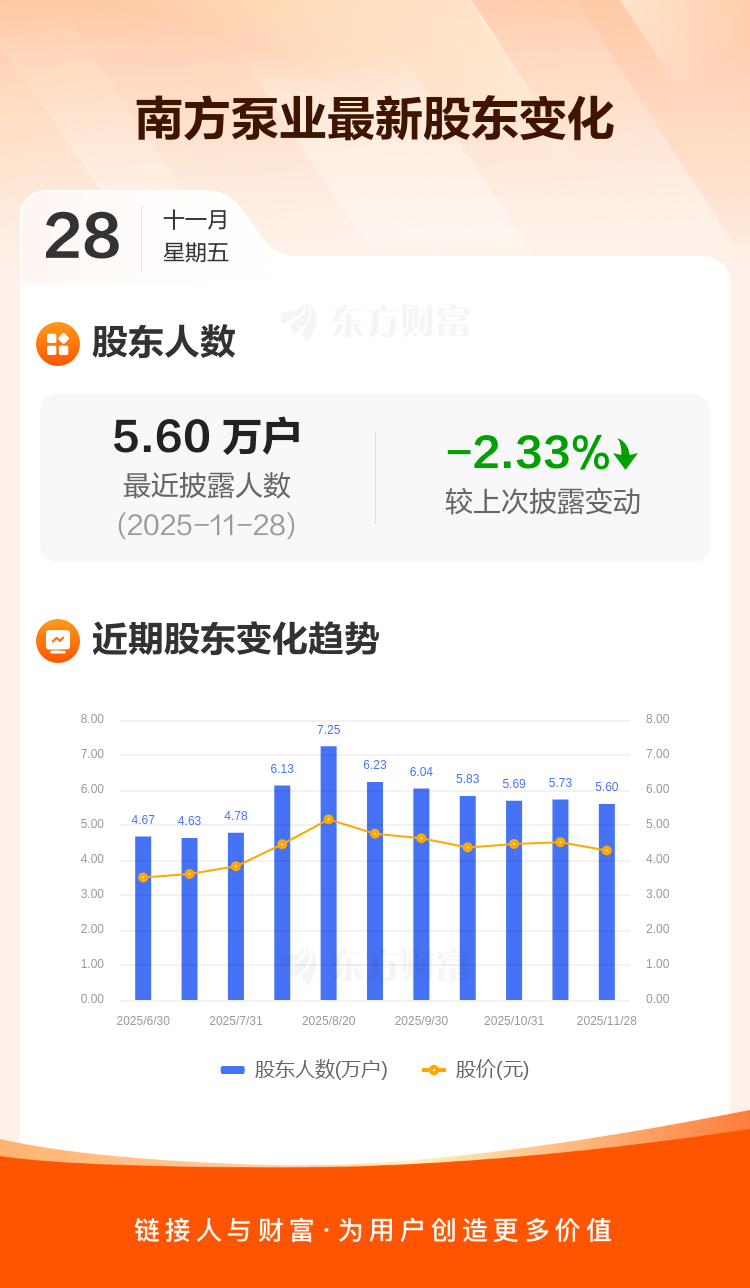 南方泵业:截至11月28日最新股东户数5.60万户,较上期减少2.33%