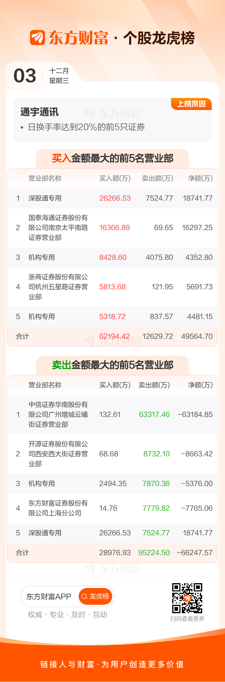 交易所2025年12月3日公布的交易公开信息显示,通宇通讯因成为日换手率达到20%的前5只证券上榜。通宇通讯当日收报28.05元,涨跌幅-2.54%,偏离值59.65%,换手率59.65%,成交额59.45亿。