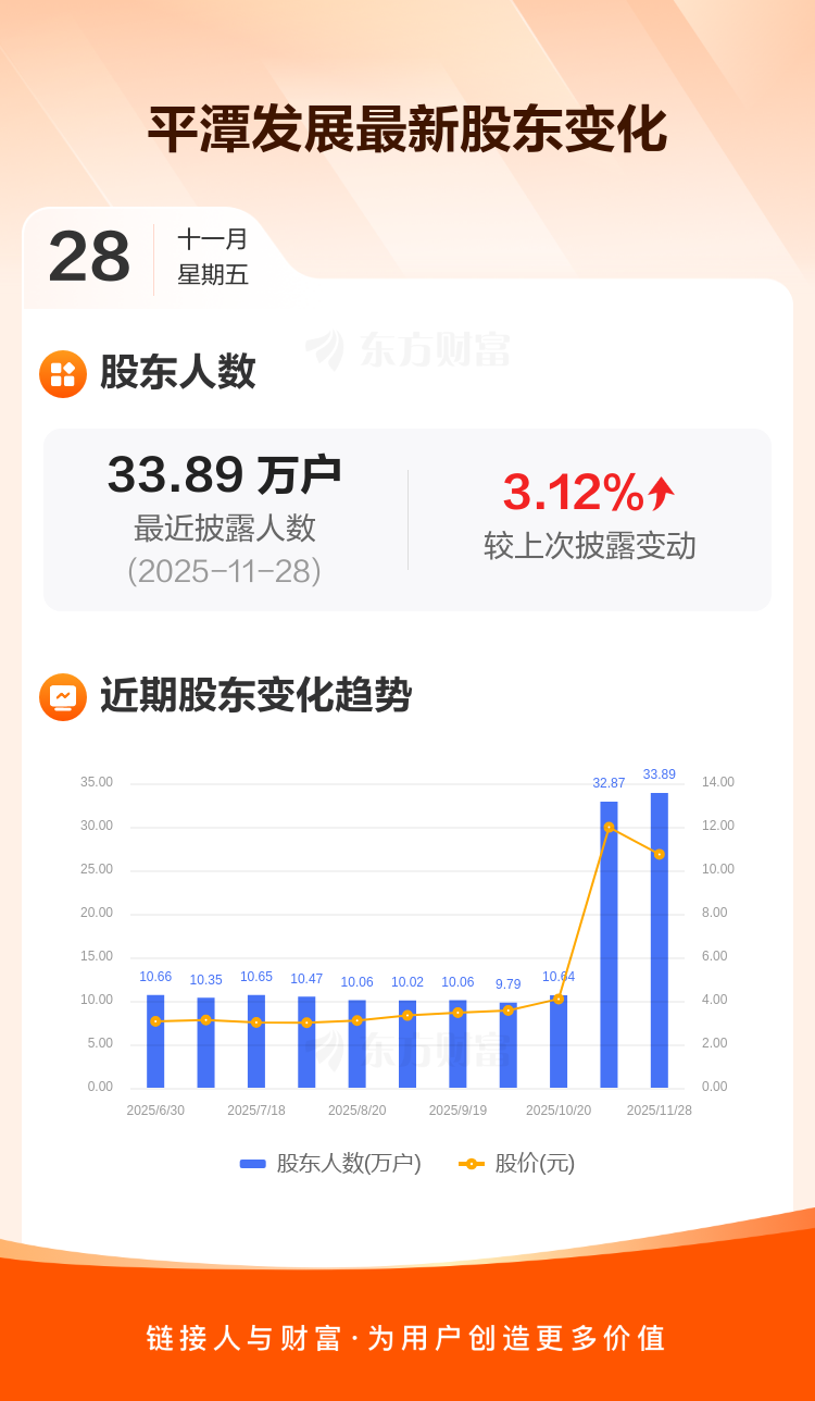 平潭发展最新披露数据显示,截至11月28日公司股东户数为33.89万户,较上期(2025年11月20日)增加1.03万户,增幅为3.12%。户均持有流通股数量由上期的5826股下降至5650股,户均持股金额由上期的6.97万元减少至6.06万元。