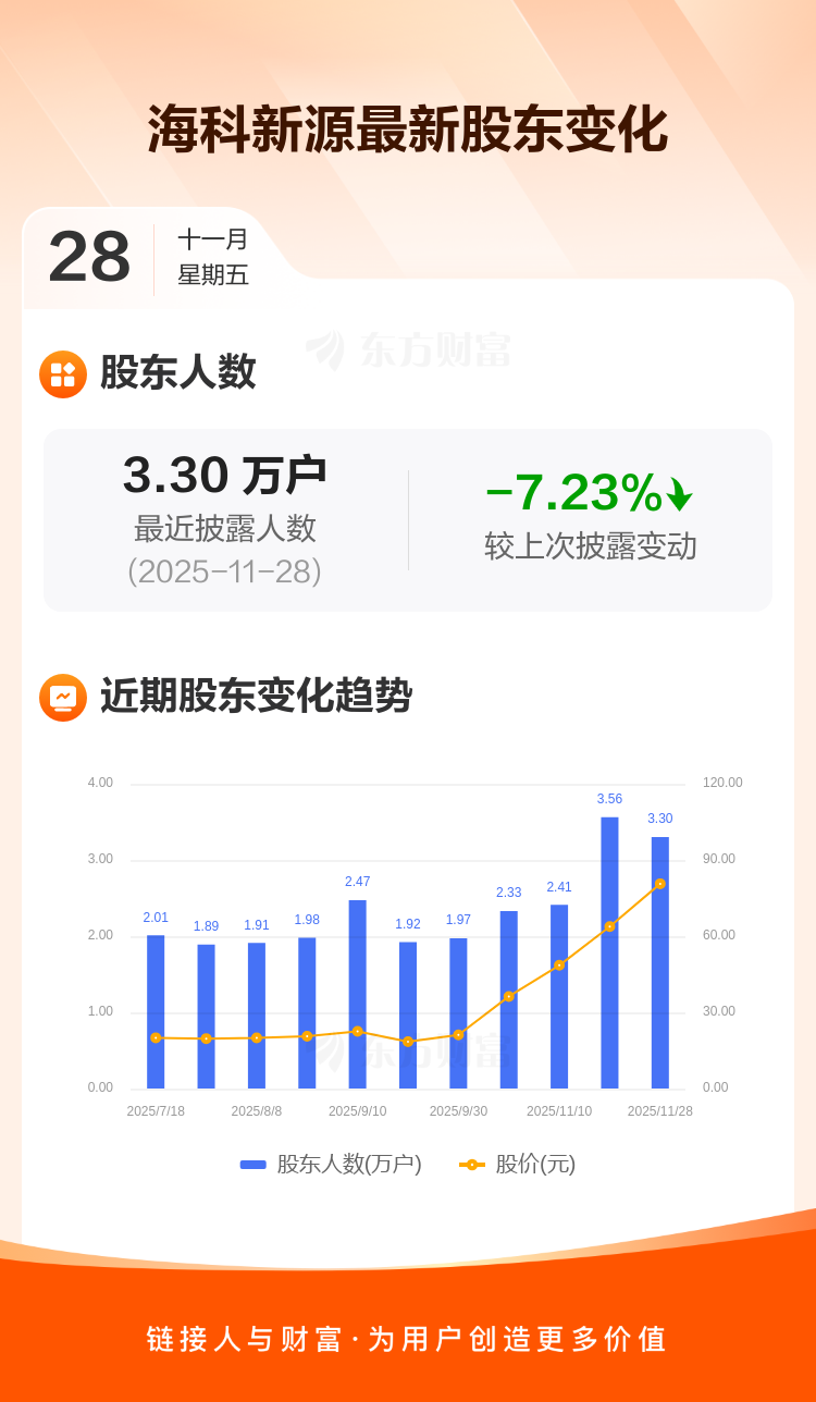 海科新源最新披露数据显示,截至11月28日公司股东户数为3.30万户,较上期(2025年11月20日)减少2575户,降幅为7.23%。户均持有流通股数量由上期的2389股上升至2575股,户均持股金额由上期的15.23万元增加至20.76万元。