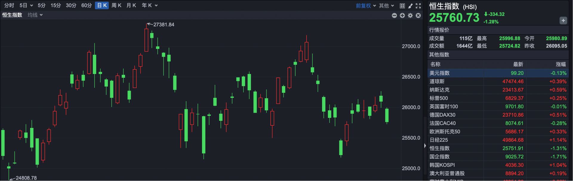 截至收盘,恒生指数报收于25760.73点,下跌334.32点,跌幅1.28%。成交量来看,今日进一步缩量,全天仅成交1644亿港元。