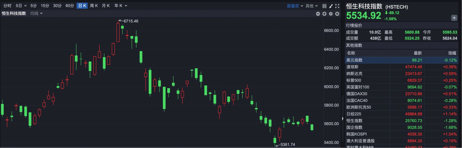 恒生科技指数报收于5534.92点,下跌89.12点,跌幅1.58%。