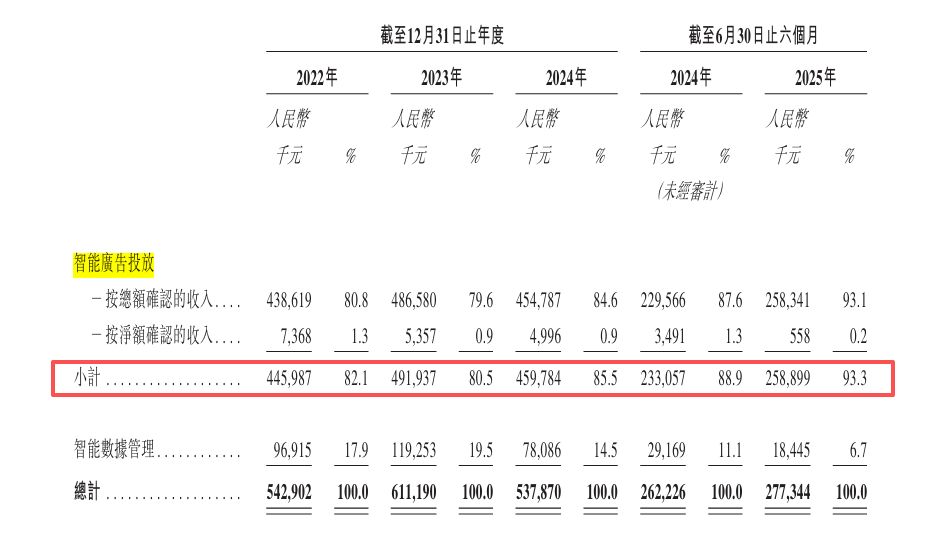 报告期内,深演智能的收入主要来自提供智能广告投放,且在报告期内的收入占比呈上升趋势——该项业务报告期内的收入占比分别为82.1%、80.5%、85.5%和93.3%。同期,智能数据管理的收入占比从17.9%降至了6.7%。