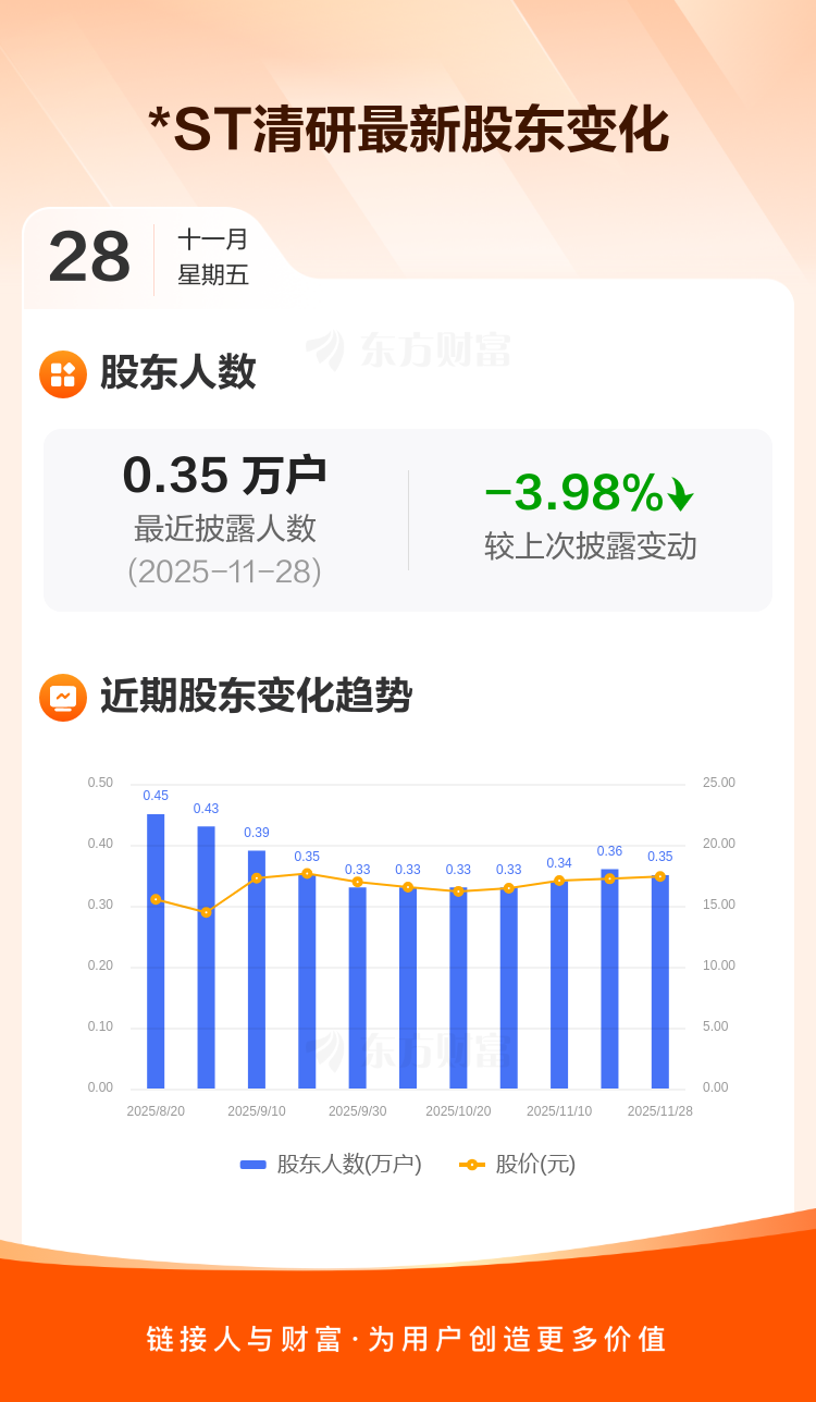 *ST清研最新披露数据显示,截至11月28日公司股东户数为3500户,较上期(2025年11月20日)减少145户,降幅为3.98%。户均持有流通股数量由上期的2.14万股上升至2.23万股,户均持股金额由上期的36.86万元增加至38.81万元。