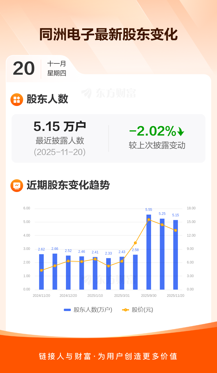 同洲电子最新披露数据显示,截至11月20日公司股东户数为5.15万户,较上期(2025年11月10日)减少1063户,降幅为2.02%。户均持有流通股数量由上期的1.31万股上升至1.34万股,户均持股金额由上期的18.90万元减少至17.60万元。