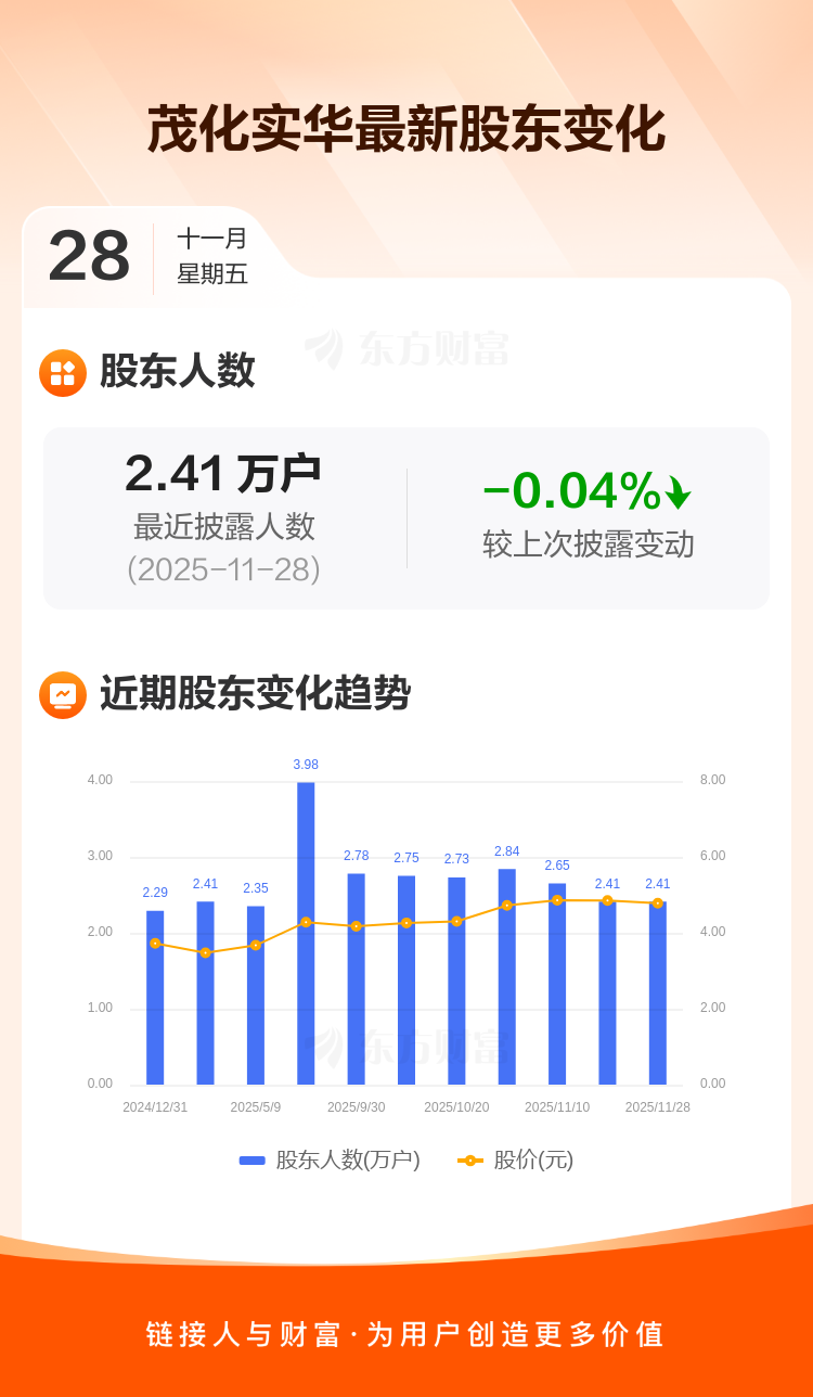 茂化实华最新披露数据显示,截至11月28日公司股东户数为2.41万户,较上期(2025年11月20日)减少10户,降幅为0.04%。户均持有流通股数量由上期的1.51万股上升至1.51万股,户均持股金额由上期的7.32万元减少至7.22万元。