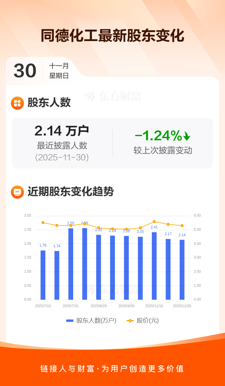 同德化工:截至11月30日最新股东户数2.14万户,较上期减少1.24%