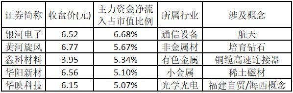 主力资金净流入金额占市值比例排名前5的个股分别为银河电子、黄河旋风、鑫科材料、华阳新材、华映科技。