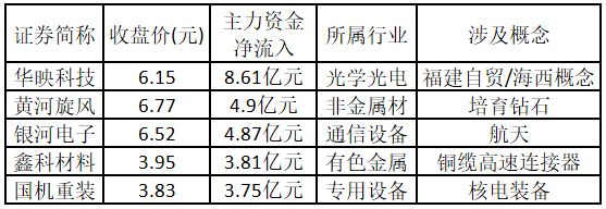 从主力资金来看,今日涨停板个股中,主力资金净流入金额排名前5的个股分别为华映科技、黄河旋风、银河电子、鑫科材料、国机重装。