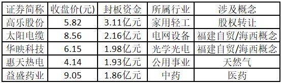 从封板资金来看,今日涨停板个股中,封板资金排名前5的个股包括高乐股份、太阳电缆、华映科技、惠天热电、益盛药业。