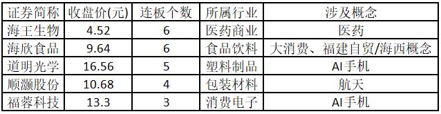 从连板情况来看,今日首板个股有37只;2连板的个股有6只;3连板及以上的个股有5只。今日连板数排名前5的个股包括海王生物、海欣食品、道明光学、顺灏股份、福蓉科技,具体如下表所示。