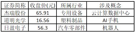 另外,连板数前5的涨停股中,有2只属于AI手机概念股,其中道明光学更是5连板股价创出历史新高。
