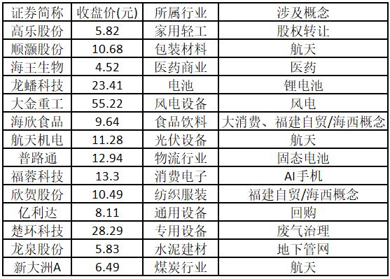 涨停板个股中,股价创出近一年新高的个股有14只(不包括创出历史新高的个股),包括高乐股份、顺灏股份、海王生物、龙蟠科技、大金重工、海欣食品、航天机电、普路通、福蓉科技、欣贺股份、亿利达、楚环科技、龙泉股份、新大洲A,具体如下表所示。
