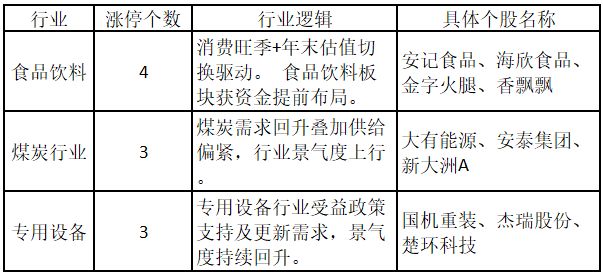从行业特征来看,今日涨停板个股中,食品饮料、煤炭行业、专用设备行业的个股最多。