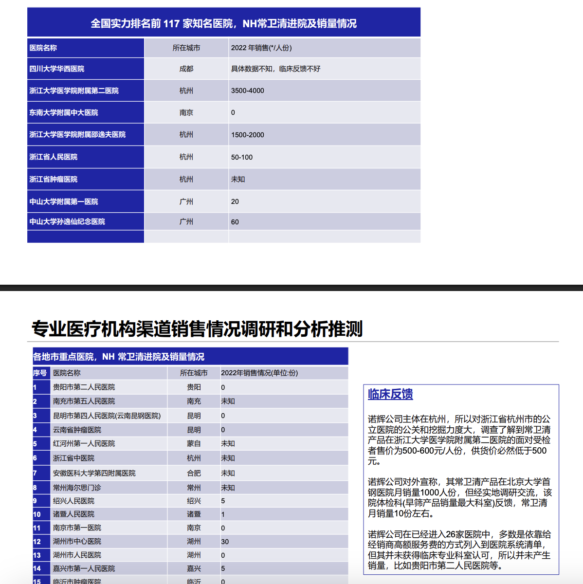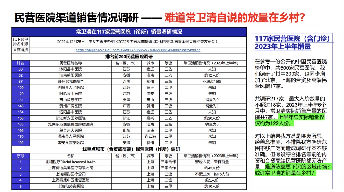 在民营医疗机构方面,报告称,CapitalWatch共调研217家,最大入院数量的不超过18家,2023年上半年6个月中,常卫清实际销售产量的医院共7家,上半年总实际销量仅仅约为122人份。