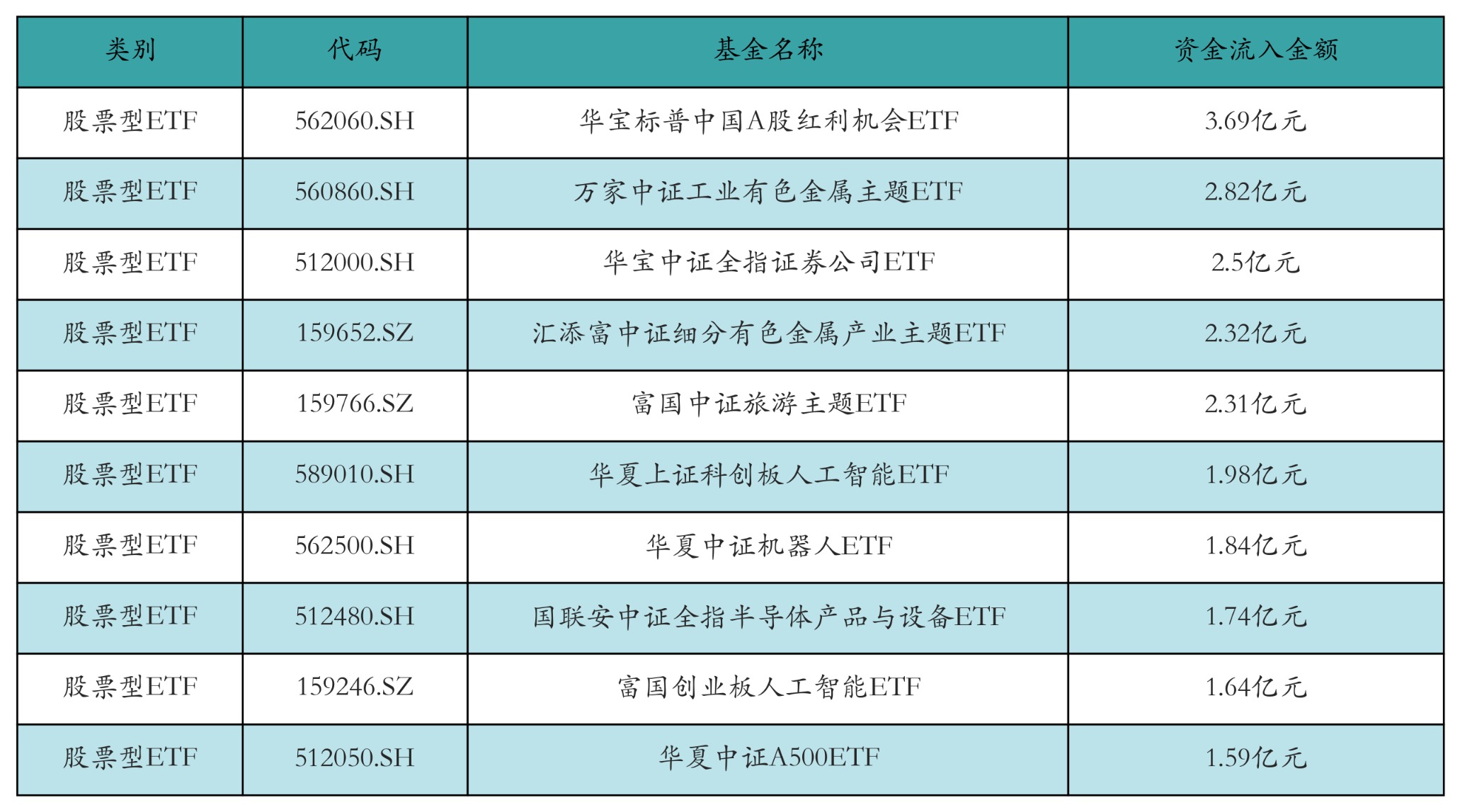 昨日股票型ETF资金流入最多的3只ETF及其流入金额分别为:华宝标普中国A股红利机会ETF(流入3.69亿元)、万家中证工业有色金属主题ETF(流入2.82亿元)、华宝中证全指证券公司ETF(流入2.5亿元)。资金流入前10详情见下表: