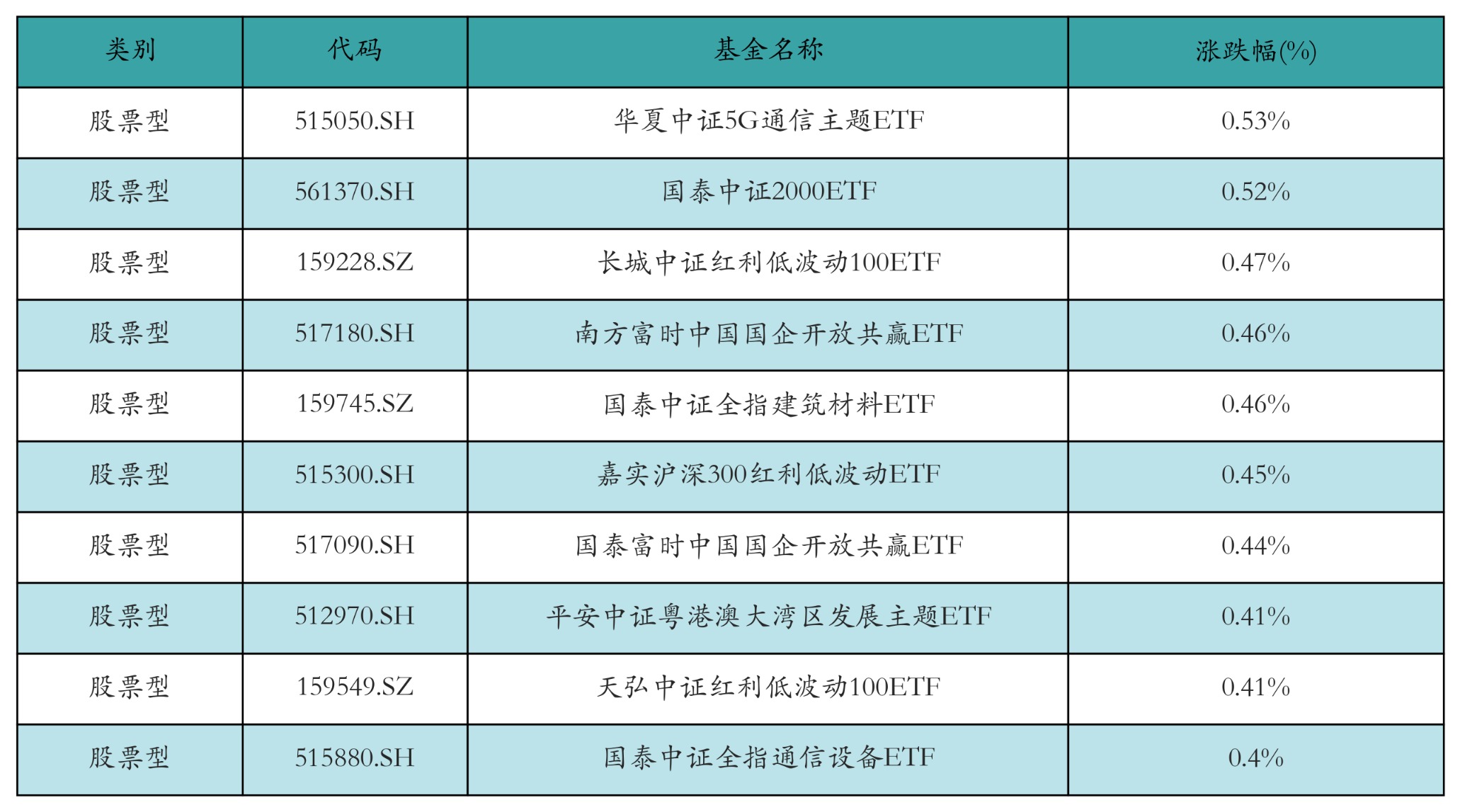 昨日股票型ETF涨幅最高的3只ETF及其收益率分别为:华夏中证5G通信主题ETF(0.53%)、国泰中证2000ETF(0.52%)、长城中证红利低波动100ETF(0.47%)。涨幅前10详情见下表: