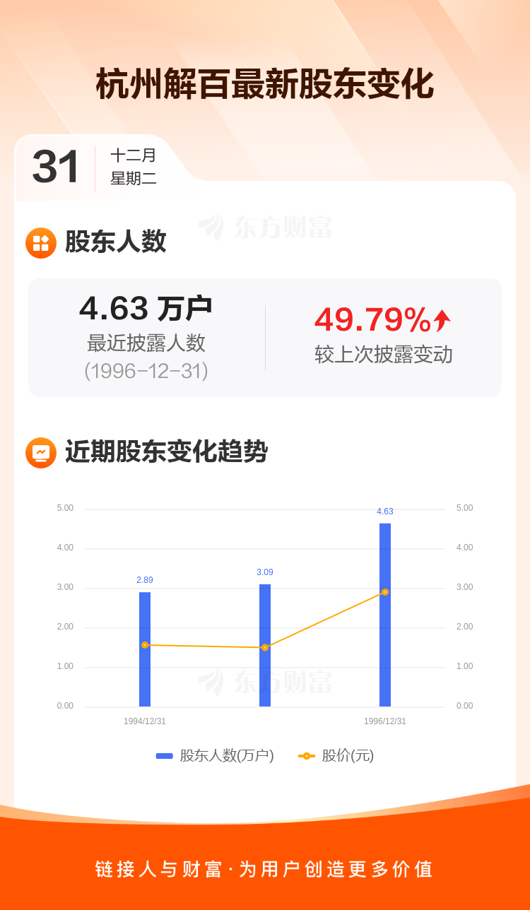 杭州解百:截至12月31日最新股东户数4.63万户,较上期增加49.79%