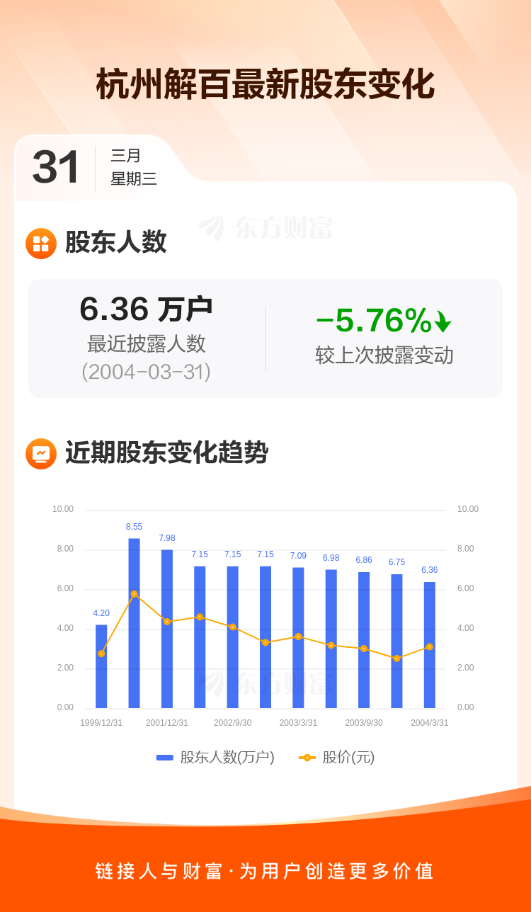 杭州解百最新披露数据显示,截至3月31日公司股东户数为6.36万户,较上期(2003年12月31日)减少3890户,降幅为5.76%。户均持有流通股数量由上期的1502股上升至1594股,户均持股金额由上期的3760元增加至4930元。