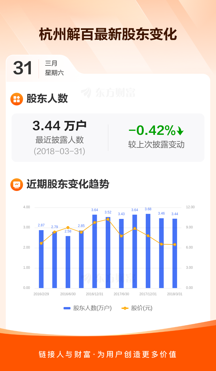 杭州解百:截至3月31日最新股东户数3.44万户,较上期减少0.42%