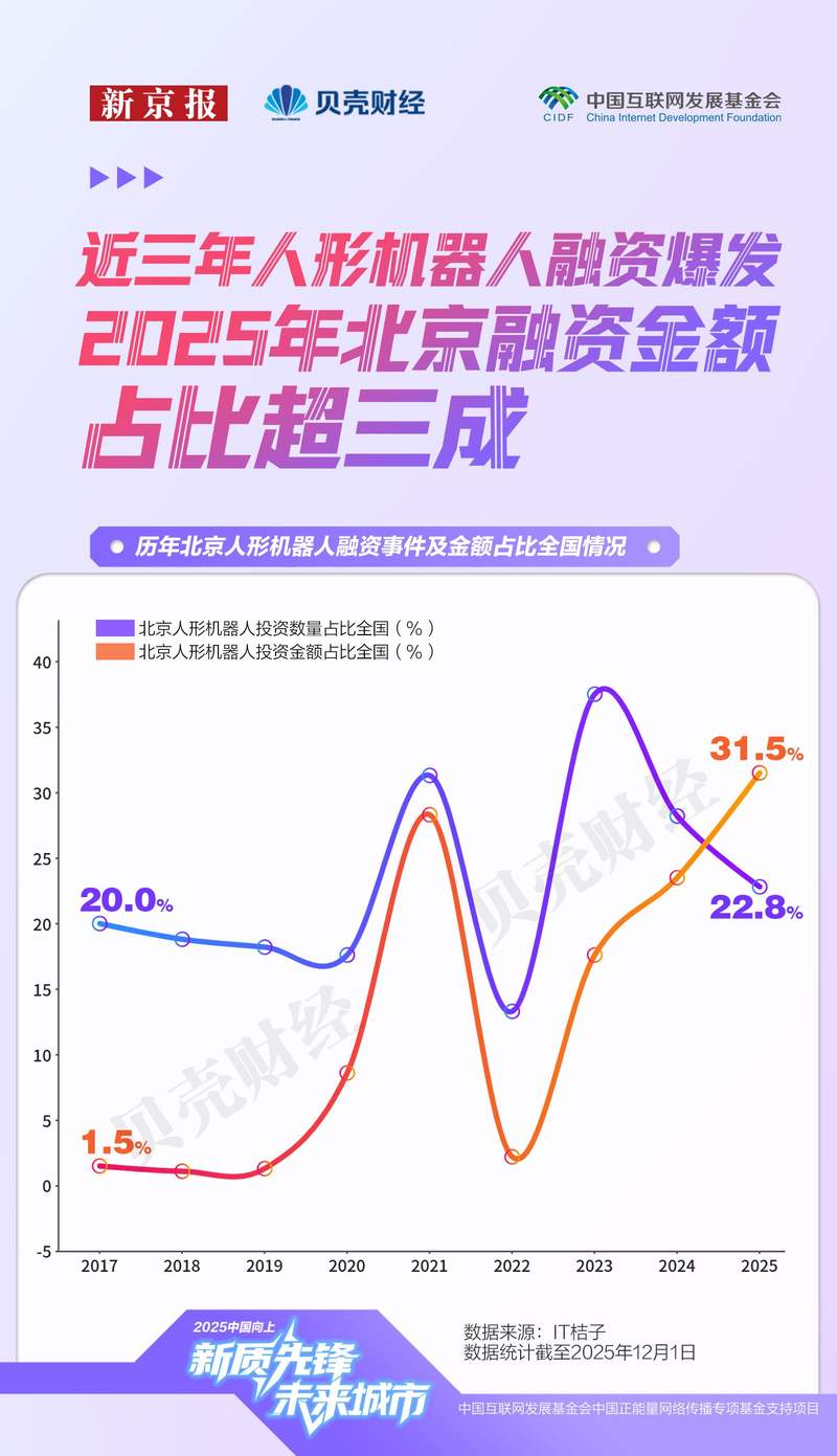 同时,近三年我国人形机器人融资明显加速。2023年以来,全国融资事件数与金额同步跃升,行业进入快速扩张周期,北京的融资表现尤为亮眼。IT桔子数据显示,截至目前,2025年北京人形机器人融资事件达到37起、金额达70.12亿元,投资金额占全国比重上升至31.5%,资本在向头部城市集中。