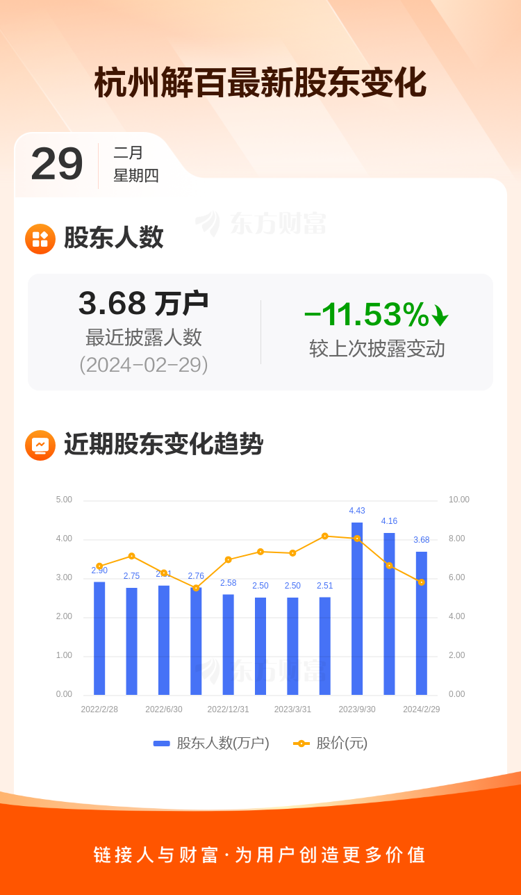 杭州解百:截至2月29日最新股东户数3.68万户,较上期减少11.53%
