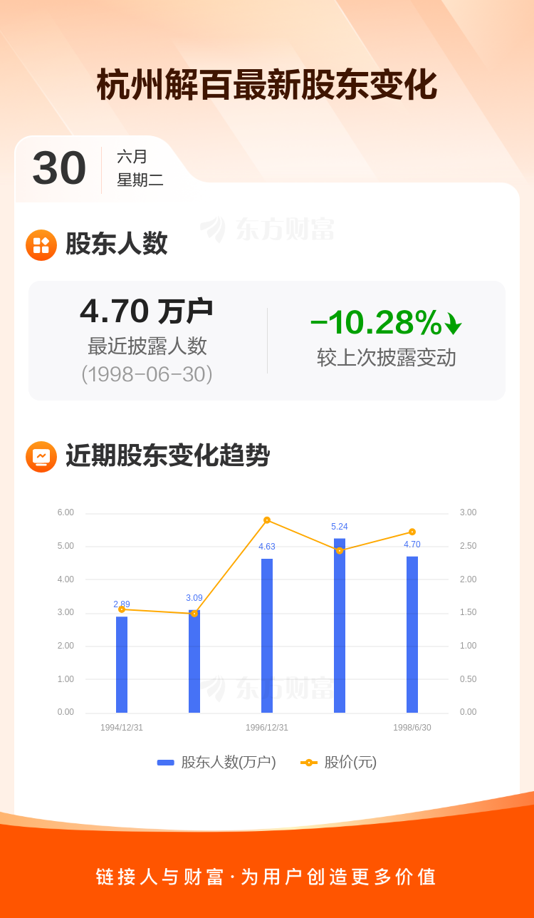 杭州解百:截至6月30日最新股东户数4.70万户,较上期减少10.28%