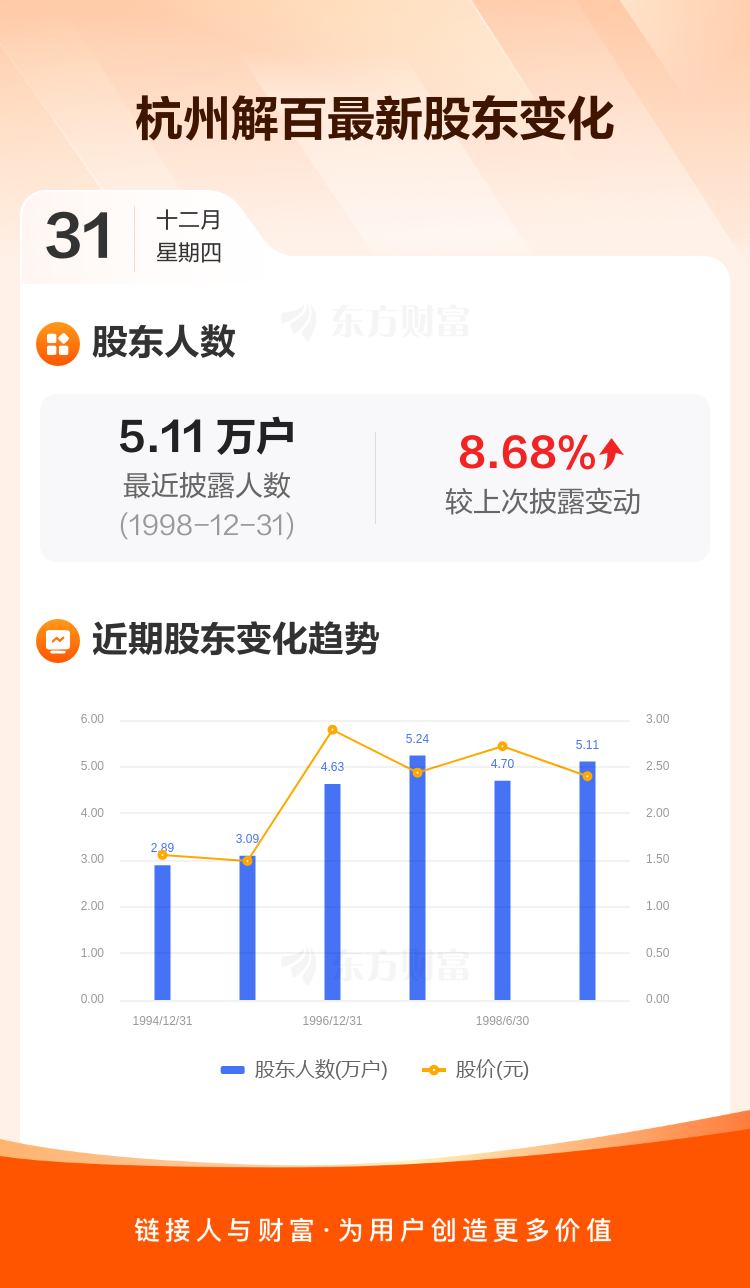 杭州解百:截至12月31日最新股东户数5.11万户,较上期增加8.68%