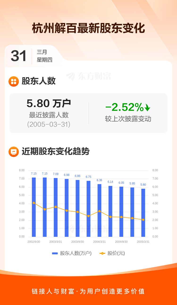 杭州解百最新披露数据显示,截至3月31日公司股东户数为5.80万户,较上期(2004年12月31日)减少1497户,降幅为2.52%。户均持有流通股数量由上期的1704股上升至1748股,户均持股金额由上期的3830元减少至3595元。
