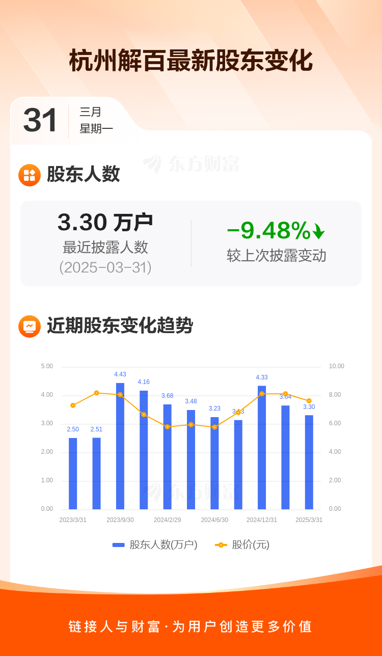 杭州解百:截至3月31日最新股东户数3.30万户,较上期减少9.48%