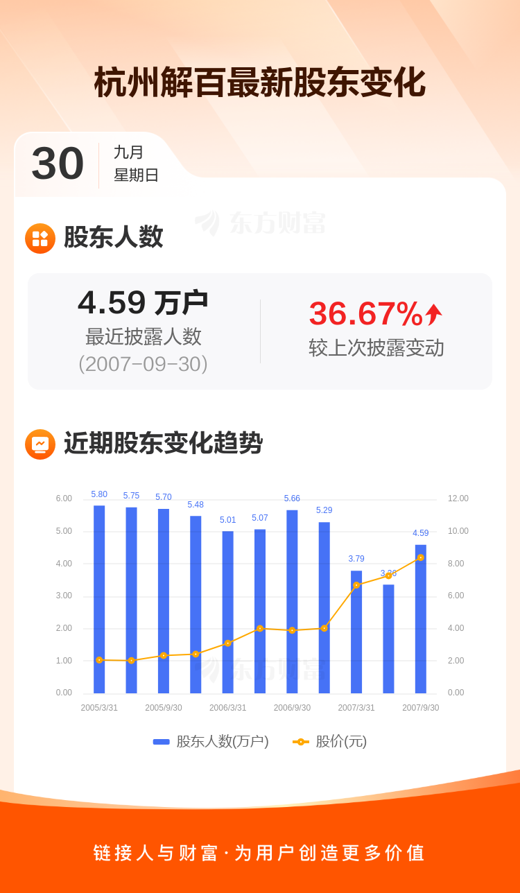 杭州解百最新披露数据显示,截至9月30日公司股东户数为4.59万户,较上期(2007年6月30日)增加1.23万户,增幅为36.67%。户均持有流通股数量由上期的6770股下降至4953股,户均持股金额由上期的4.92万元减少至4.16万元。