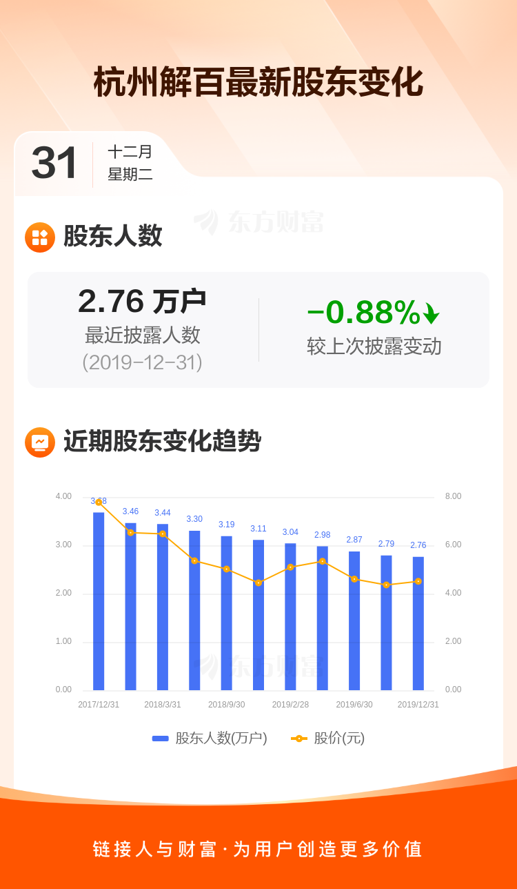 杭州解百:截至12月31日最新股东户数2.76万户,较上期减少0.88%