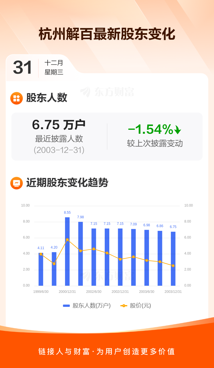 杭州解百:截至12月31日最新股东户数6.75万户,较上期减少1.54%